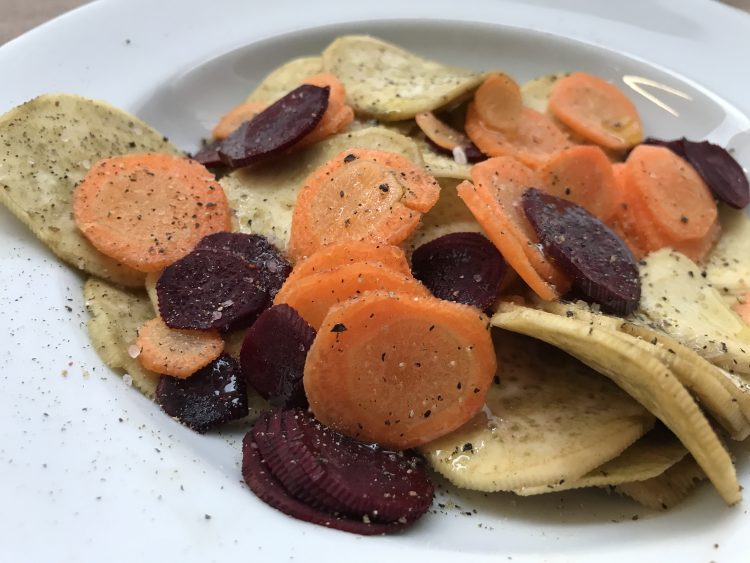 Passar os três vegetais num ralador (ou “mandolin”), deixar as fatias bem finas, misturar, colocar os temperos e servir.